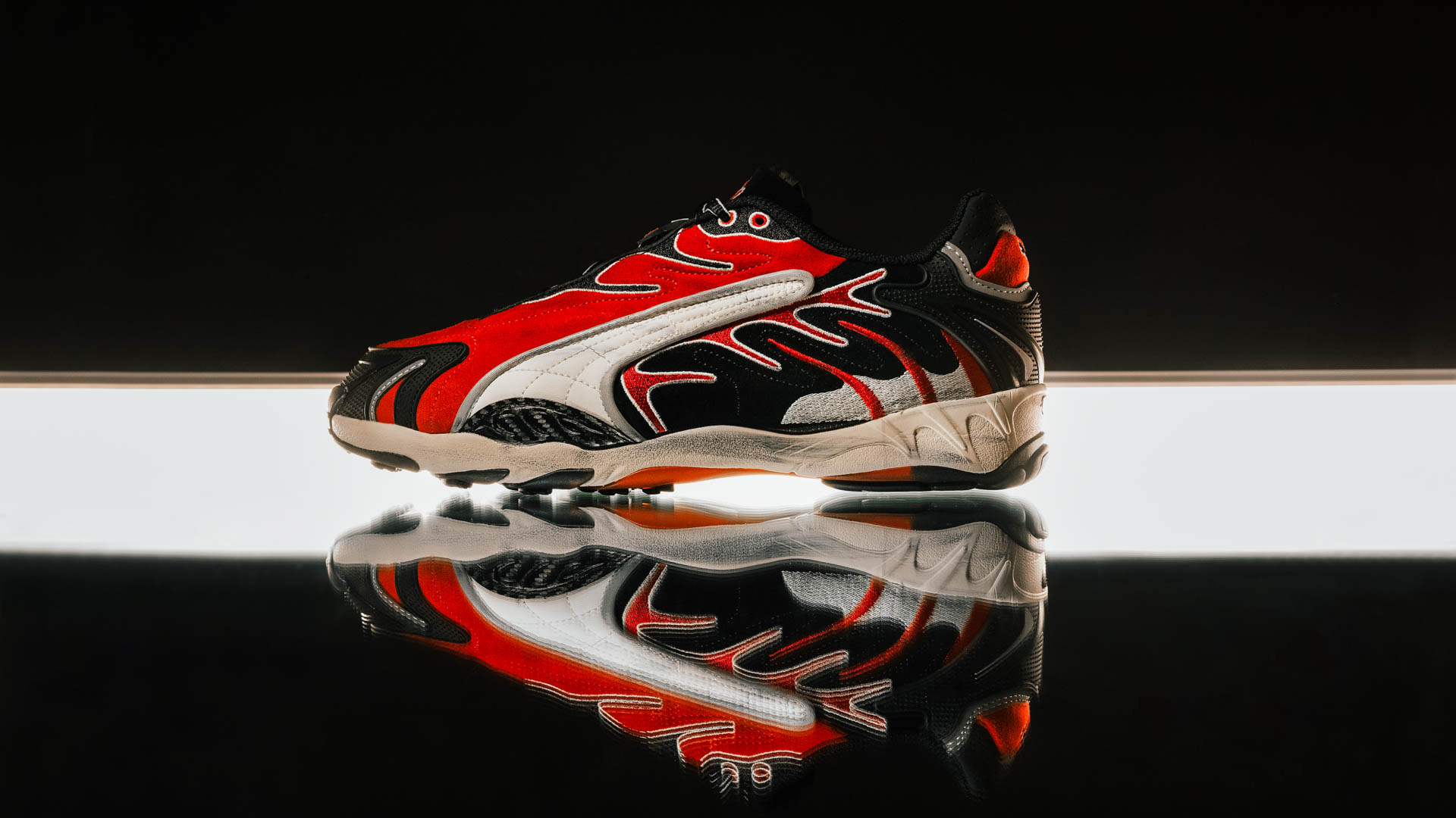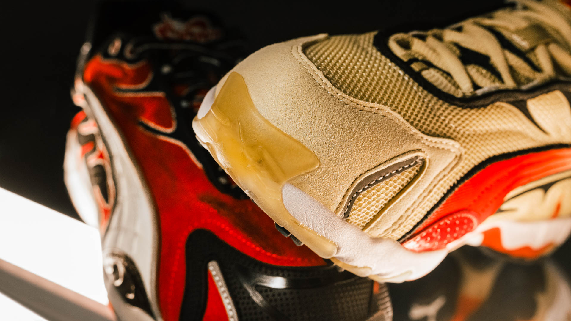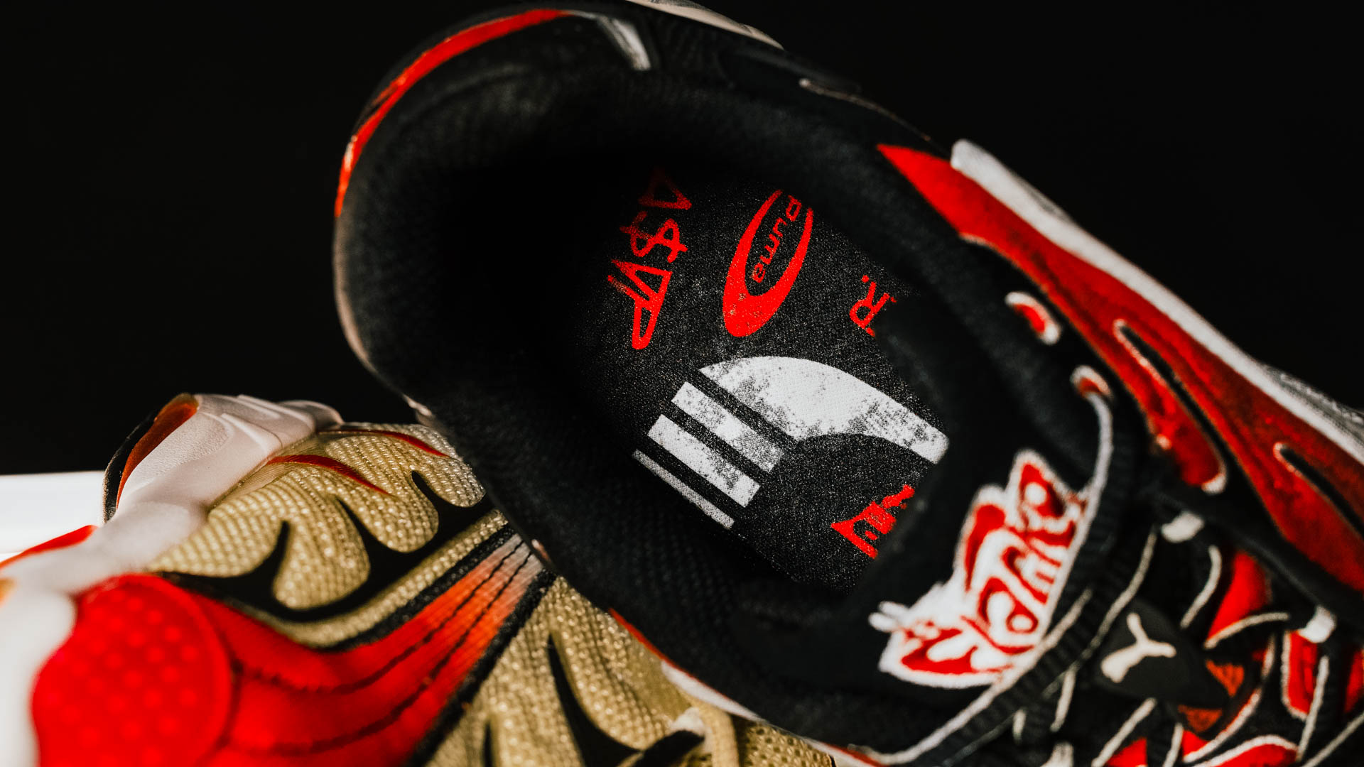 Особенности модели видны в деталях: массивная подошва с заметным амортизирующим блоком, необычные материалы верха и фирменные элементы бренда, переработанные под эстетику артиста. Расцветка ‘Black Pop Red’ поражает контрастным сочетанием черного с яркими красными акцентами, подчеркивая смелость и дерзость дизайна.