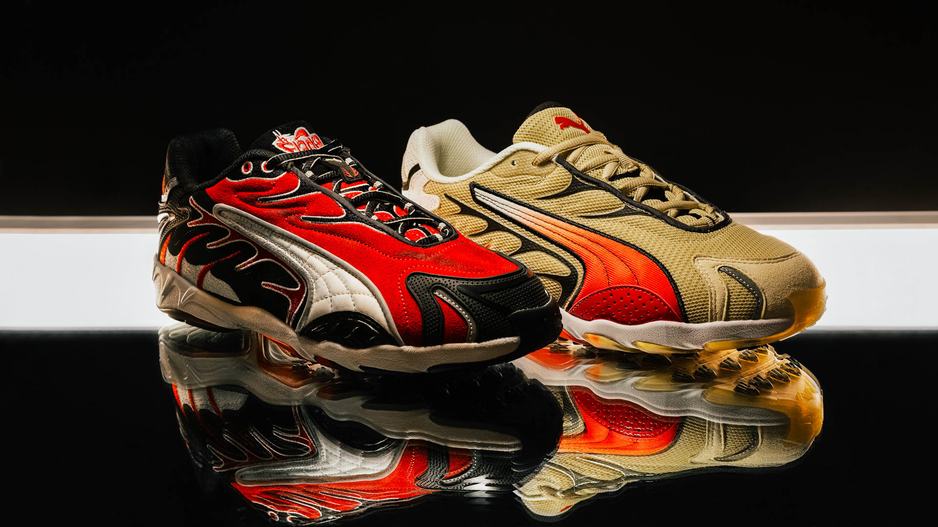 В то же время ‘Summer Melon’ переносит кроссовки в летнее настроение: нежные персиково-оранжевые тона на белом фоне делают их легкими и яркими, словно свежий фруктовый коктейль для городских улиц. Каждая расцветка передает свою историю, но обе сохраняют узнаваемый дух ASAP Rocky и ностальгический шарм оригинальной Puma Inhale OG.